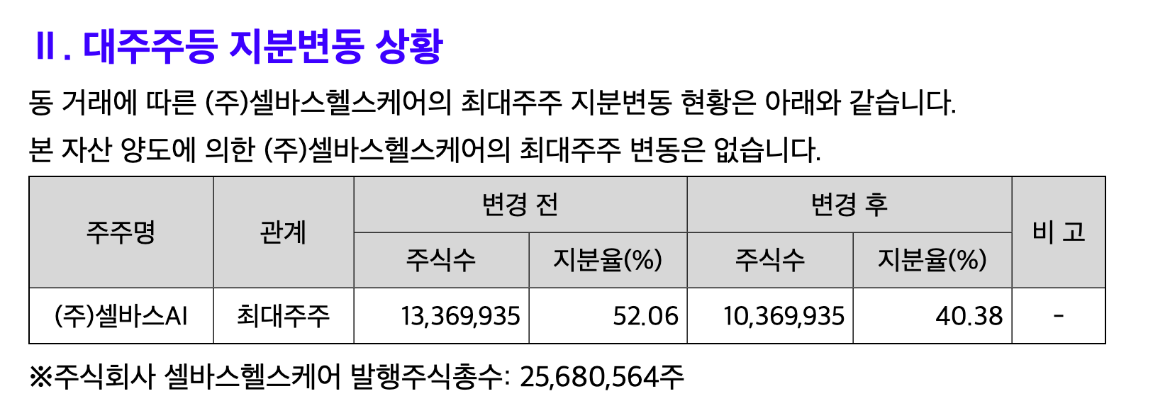 셀바스 헬스케어의 주식 219억을 셀바스 AI 가 받았습니다. 셀바스 헬스케어의 최대주주로 셀바스AI 가 등극.