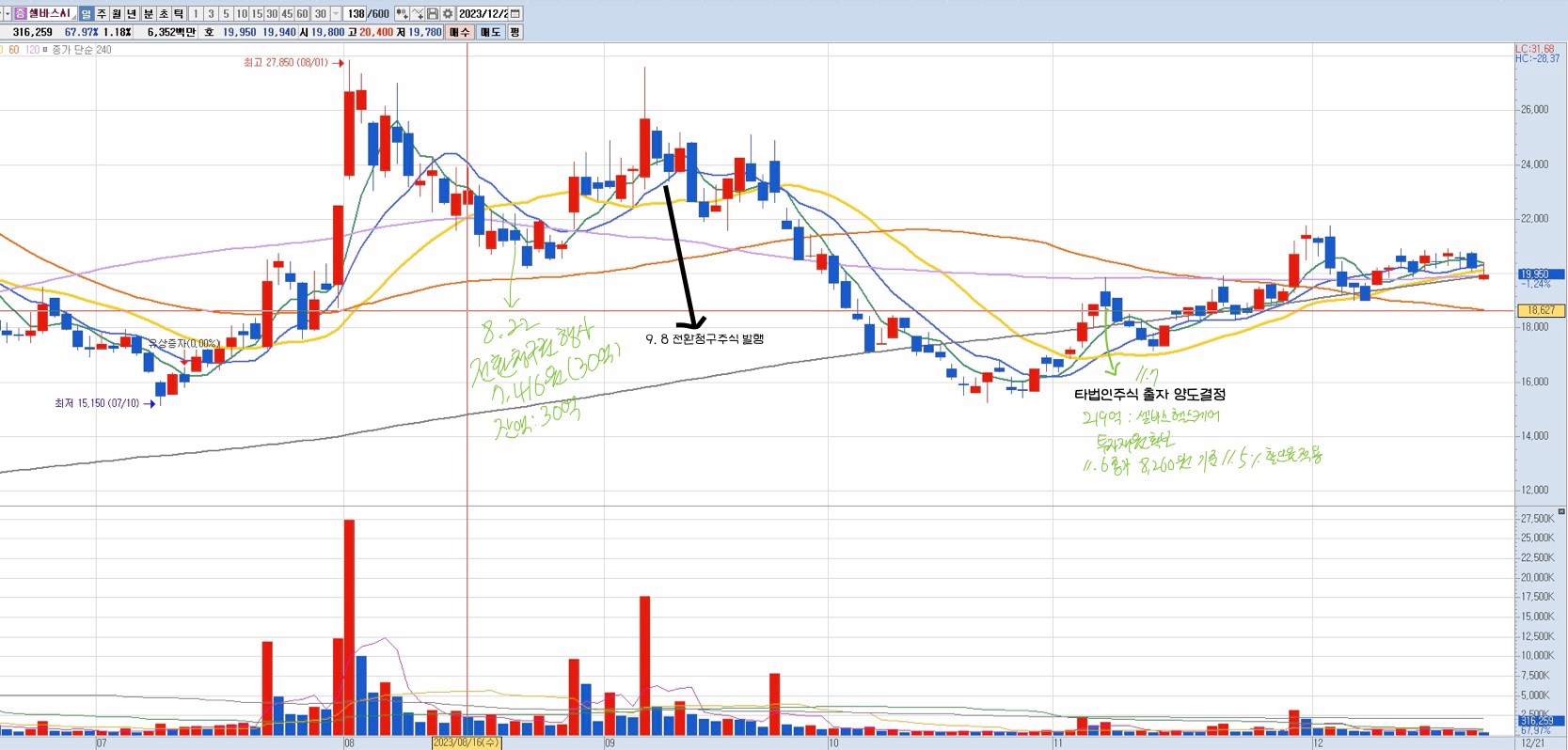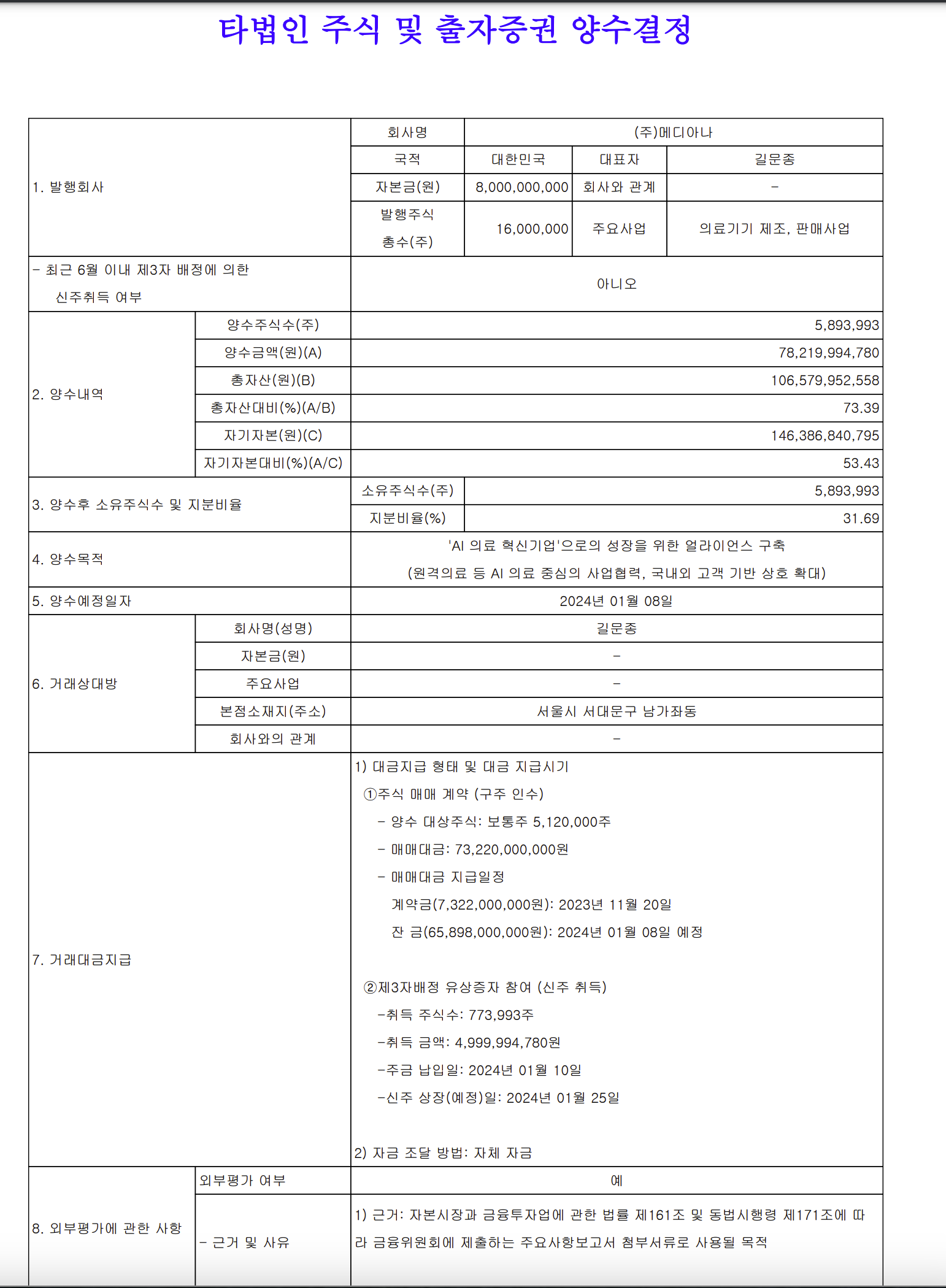 두 번째는 제3자 배정 유상증자로 신주를 50억 가량 2024.1.25에 취득예정입니다.