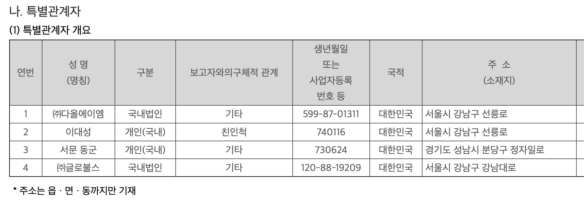 그리고 특수관계인으로 등재된 (주) 글로불스는 서문 동군의 소유