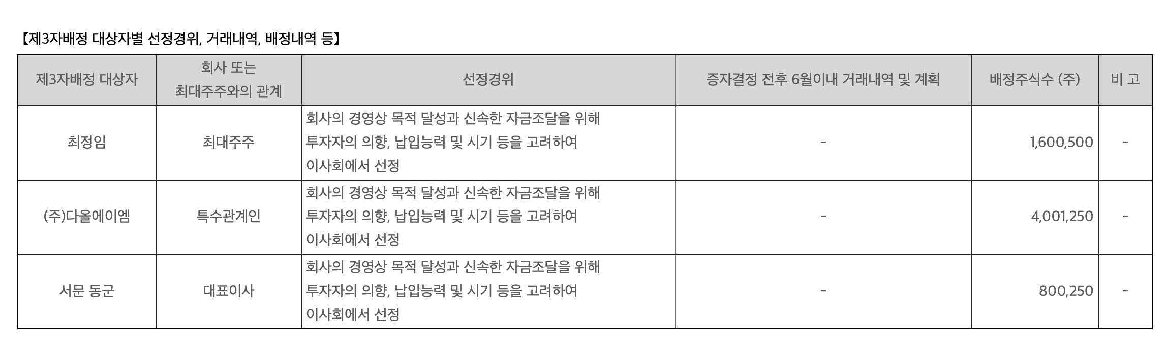 최대주주와 특수관계인이 500원에 배정받았습니다.(6,402,000주 1년간 보호예수 2024.12.19까지)