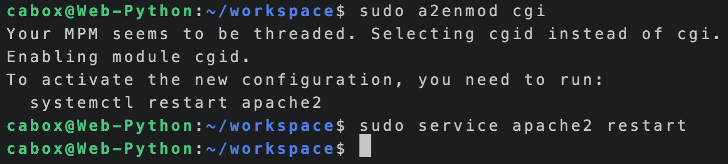 아파치 2의 CGI 기능을 켜는 명령어. 입력 후 재시작을 해줘야 적용된다.