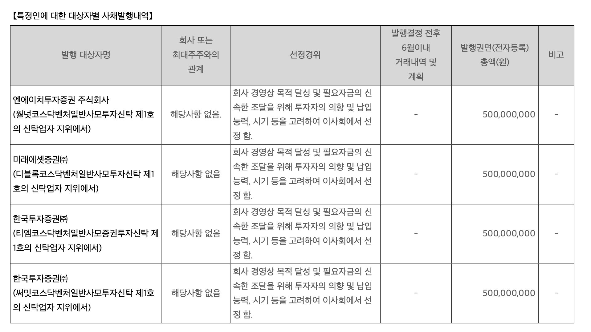 발행대상 : 주식회사 빅애플 리코(천정식 100%)