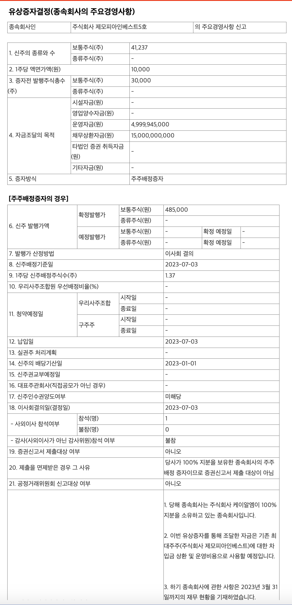 - 2023.4.28 5회차 무기명식 인권부 무보증 전환사채 납입 200억원.(표면이자 0%)