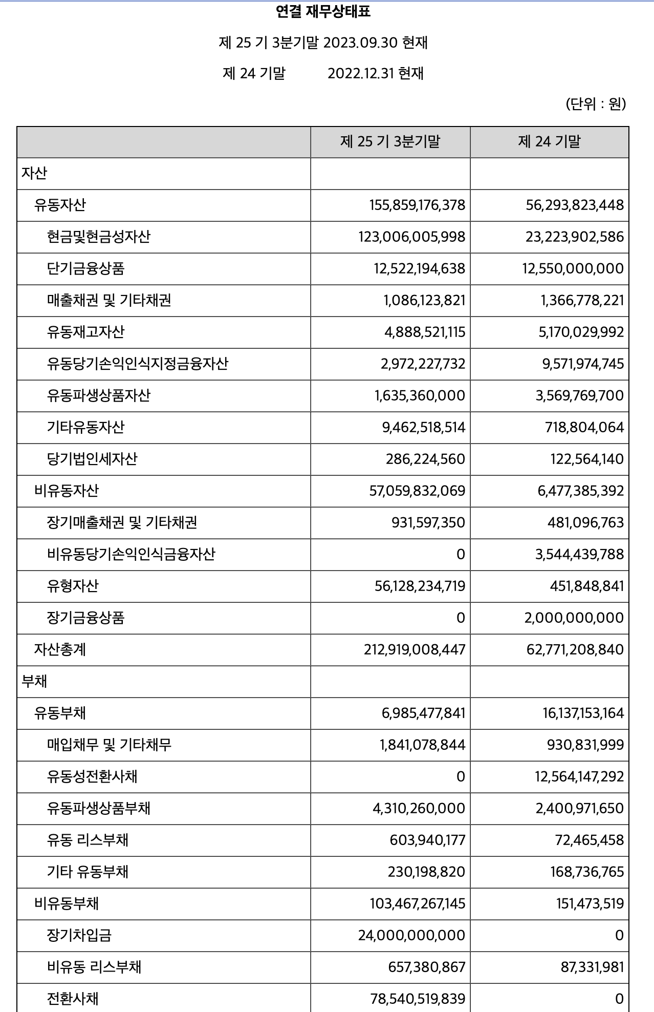 연결재무상태표의 유동자산은 100억원정도 늘었네요.