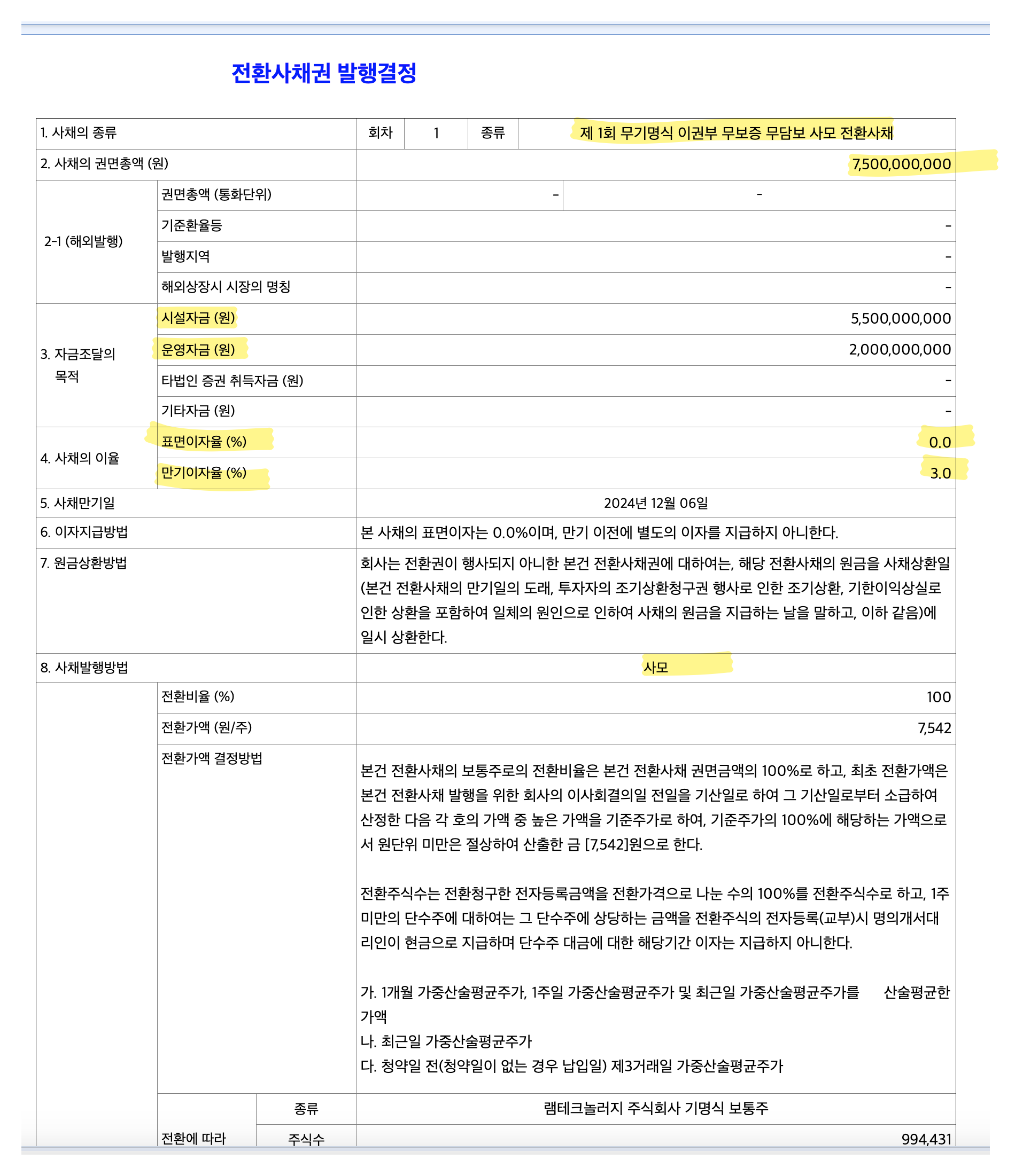 5,951 -> 5,280(최저 전환가액) / 1,420,454주 / 75억 원