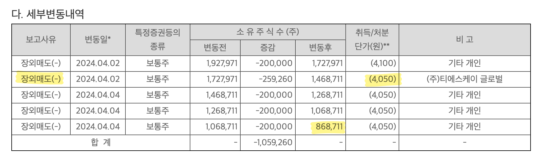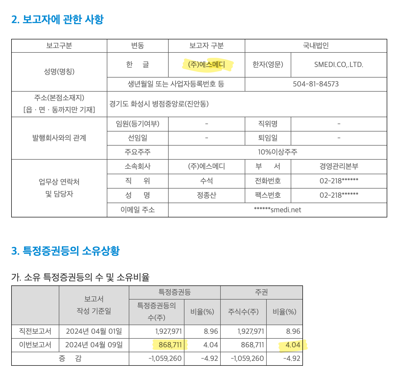 이전 최대주주였던 에스메디가 장외매도로 지분을 절반 이상 정리