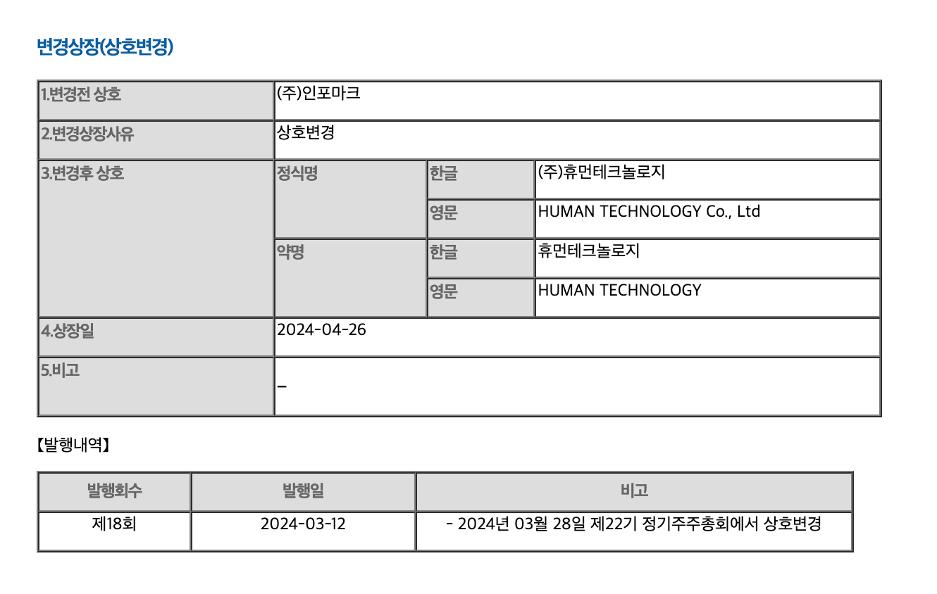 얼마 전부터 관심 있게 지켜보았던 인포마크... 이제는 사명이 변경되어 휴먼테크놀로지가 며칠 전 약간 급등을