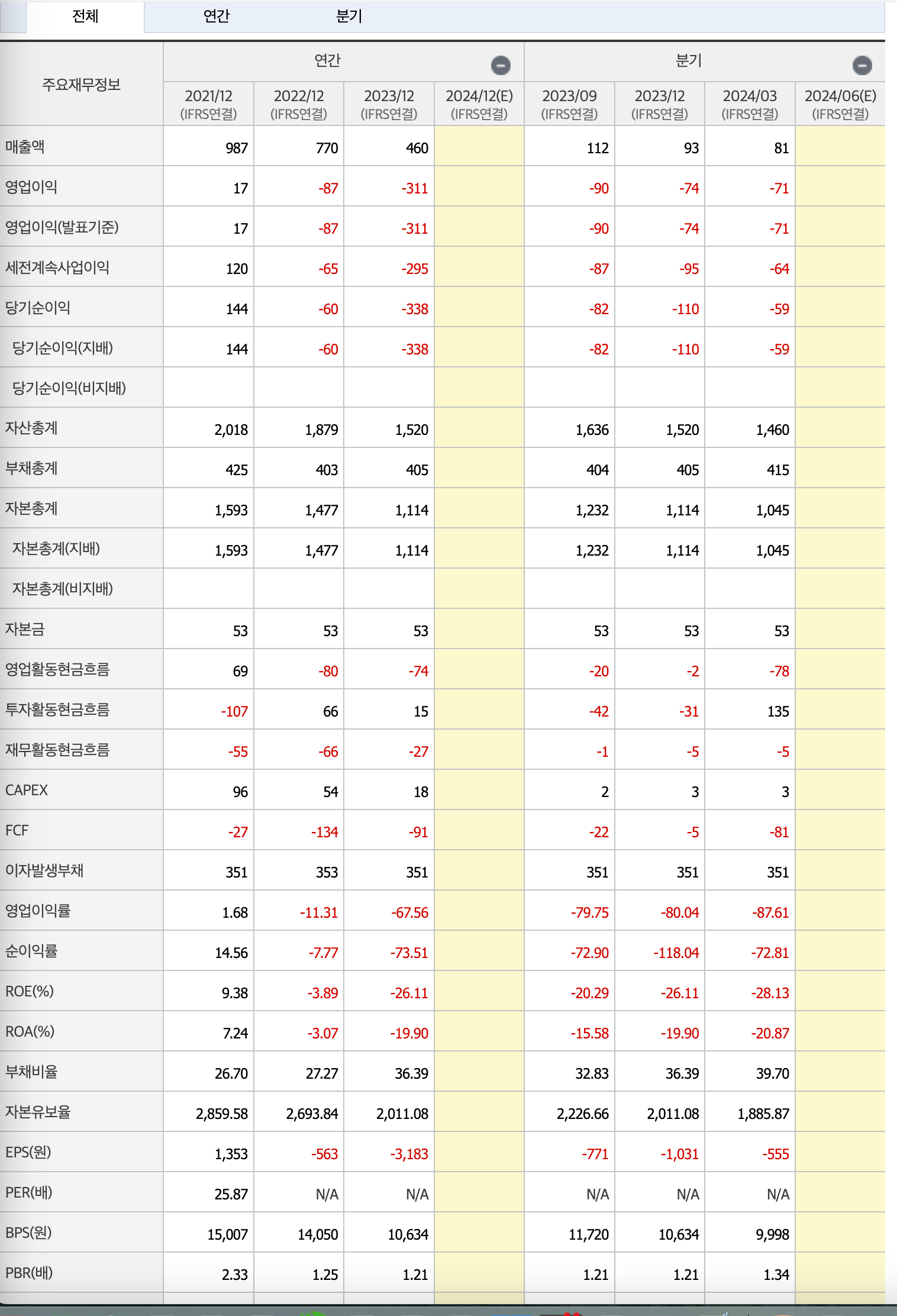 매출은 갈수록 악화, 수주잔고는 남아있지만 영업이익률이 마이너스라