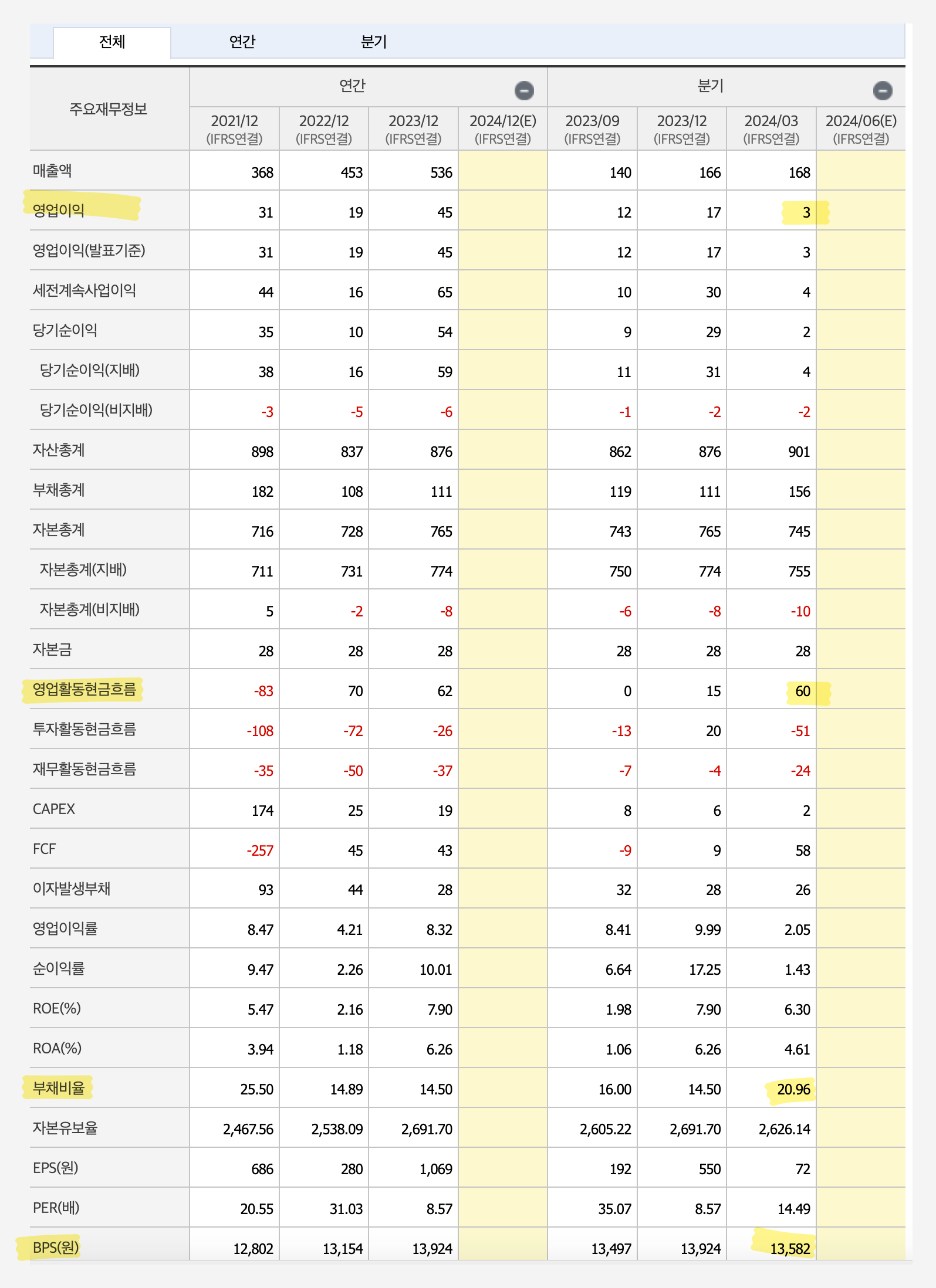 재무는 부채가 별로 없는 점은 괜찮고 영업이익도 적자는 아니지만 많이 줄어든 모습이네요.