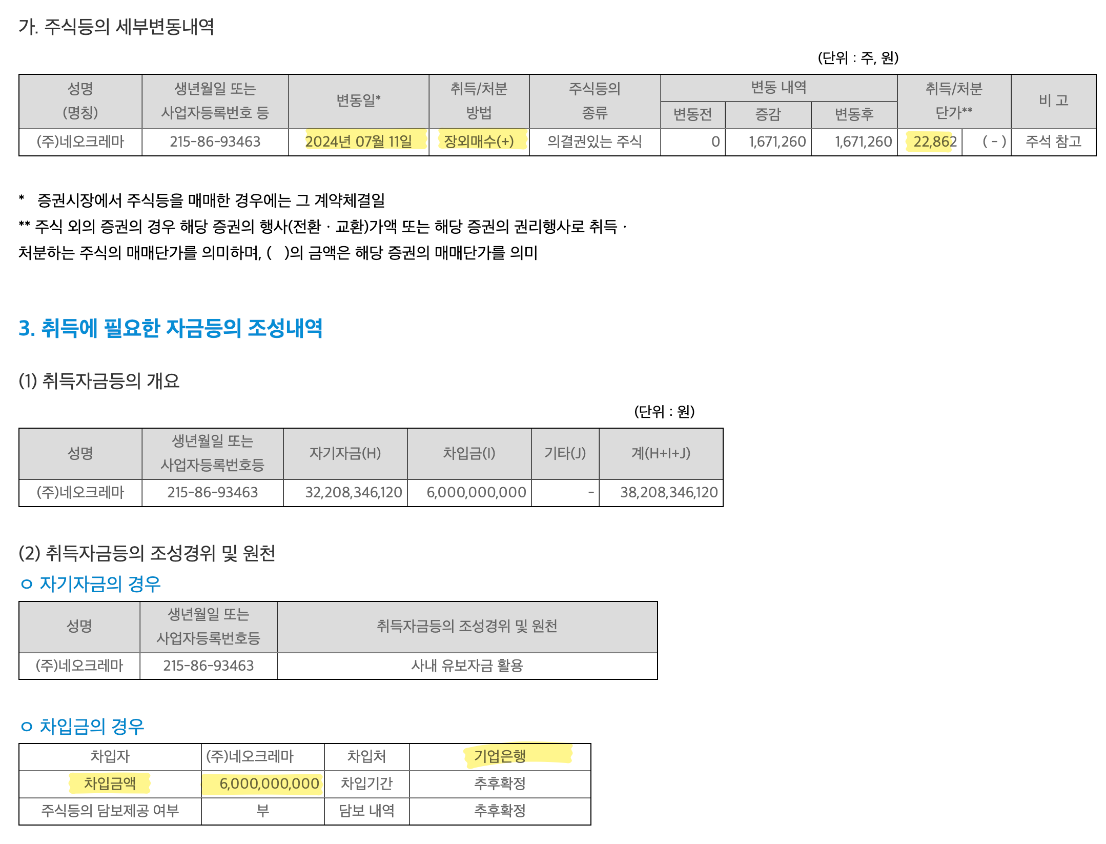 네오크레마가 경영권 목적으로 장외매수 지분 취득.