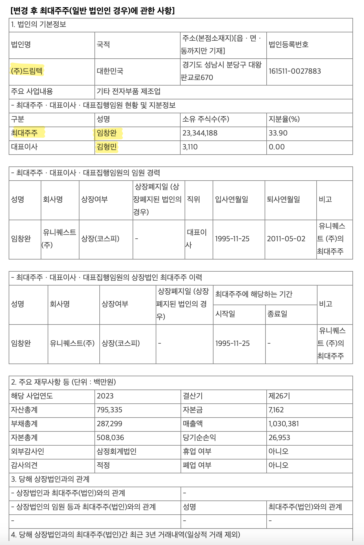 드림텍이 새로운 최대주주가 되는데, 드림텍의 최대주주가 임창완이고 이 사람은 현재 (주)유니퀘스트의 대표이사입니다.